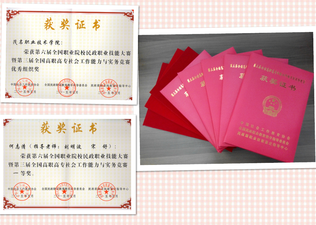 在2015年刚刚闭幕的第六届全国职业院校民政职业技能大赛暨全国第三届高职高专社会工作专业学生实务能力竞赛上,思政部社会工作专业学生代表在大赛中荣获4项个人一、二、三等奖,还获优秀组织奖、优秀指导教师奖等共八项大奖佳绩!