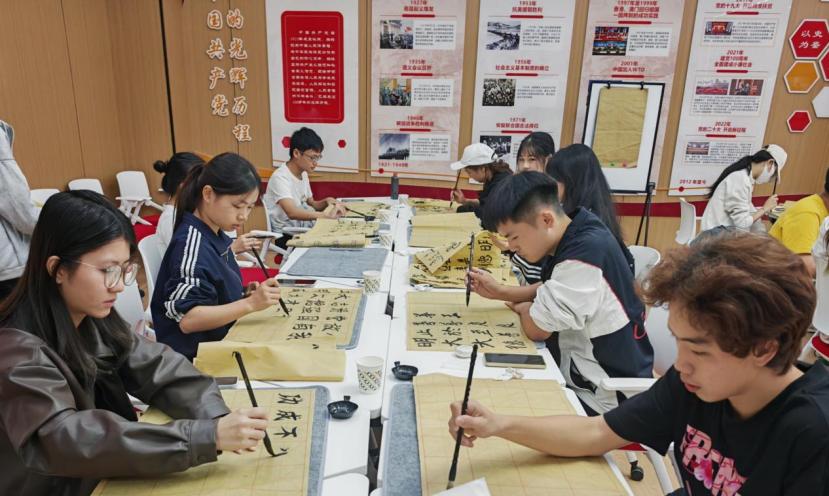 活动现场布置精心,笔墨纸砚一应俱全。在李梓萌老师的悉心指导下,同学们从执笔姿势、运笔方法等基础要领学起,逐步领略书法艺术的独特魅力。随后,活动聚焦学习领会习近平总书记关于青年工作的重要论述,同学们从“立大志、明大德、成大才、担大任”、“奋斗是青春最亮丽的底色”、“请党放心,强国有我”等二十句饱含期望的寄语中选取内容进行书写练习。笔墨挥洒间,抽象的理想信念化为具象的艺术表达,总书记的殷切嘱托通过传统书法的形式深深浸润学生心田。