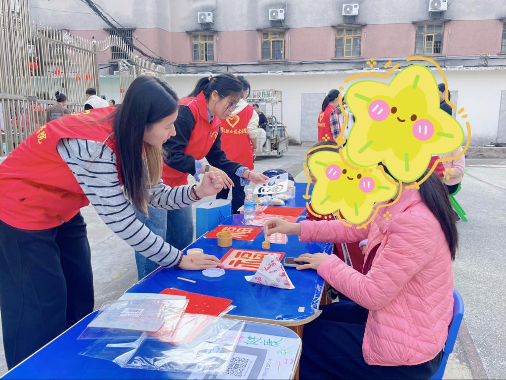 活动现场划分了美食区、文化体验区、手工艺年货区、游戏互动区等多个主题区域,内容丰富、形式多样。社工学生们化身“庙会协理员”开展活动。在文化体验区与游戏区,他们引导耐心讲解传统习俗,鼓励孩子参与投壶、套圈、拓印等传统游戏,并适时给予帮助与喝彩。学生身着红色志愿服,与老师们共同装饰摊位,营造出红火喜庆的节日景象,学生们还积极协助现场秩序维护等工作,确保了活动在安全、有序、温馨的氛围中进行。