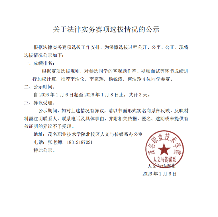 关于法律实务赛项选拔情况的公示