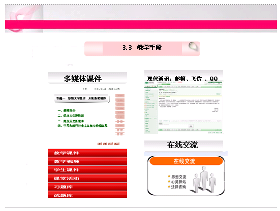 目前,课程组已基本完成了《思想道德修养与法律基础》精品课程网站建设。网站涵盖了“课程简介、教师队伍、教学大纲、实践教学、教学方法、案例分析、在线教案、教学课件、教学视频、学生课件、课堂活动、习题库、试题库、在线交流”等十几项内容,为师生教与学提供了一个良好的资源共享和信息交流平台。
