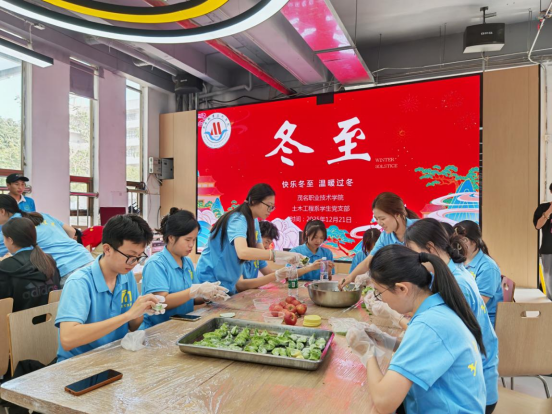 冬至阳生,岁回律转。2025年12月21日,茂名职业技术学院土木工程系学生党支部以“快乐冬至,温暖过冬”为主题,开展冬至感恩系列活动。学生党支部师生党员、系团学、系青协携手包五彩水饺、制暖心汤圆,更将这份冬日暖意送到校园一线工作者手中,以实际行动传承传统文化、践行感恩初心。