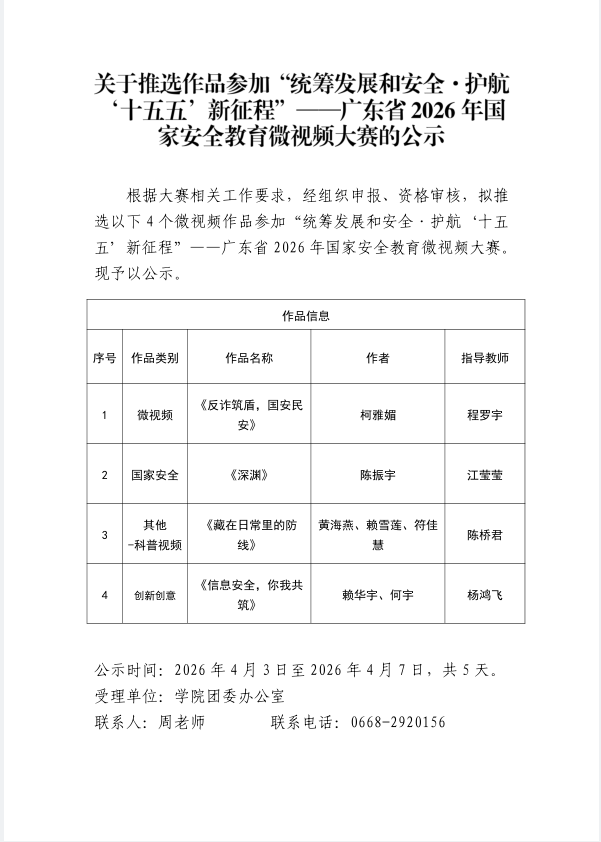 广东省2026年国家安全教育微视频大赛作品推荐公示