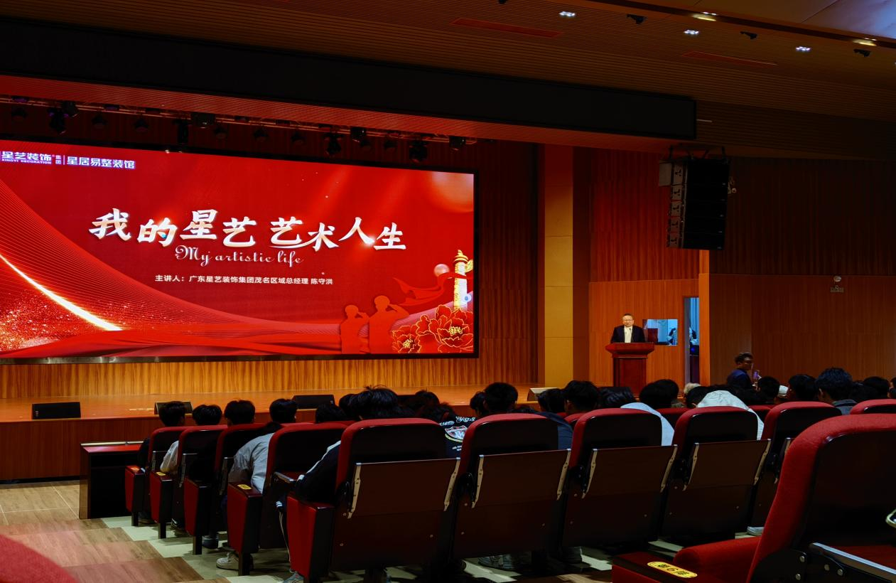 为助力复学退伍军人同学更好融入校园学习生活,实现军旅生涯与学业发展的无缝衔接,引导24级、25级学子合理规划学业,帮助2026届毕业生迈向成功就业之路,12月25日下午,学生工作部、保卫部、土木工程系及学校“一站式”学生社区、思想政治辅导员工作室联合在南校区学术报告厅举办了“复学退伍军人暨我的星艺艺术人生(第二期)”讲座。邀请广东星艺装饰集团茂名区域总经理陈守洪带领茂名星艺众多资深设计师出席讲座。土木工程系党总支副书记李振潭、南校区各系辅导员、复学退伍军人学生、土木工程系部分学生近500人聆听了讲座。讲座现场座无虚席,大家的热情参与,为讲座注入了满满的期待与活力。